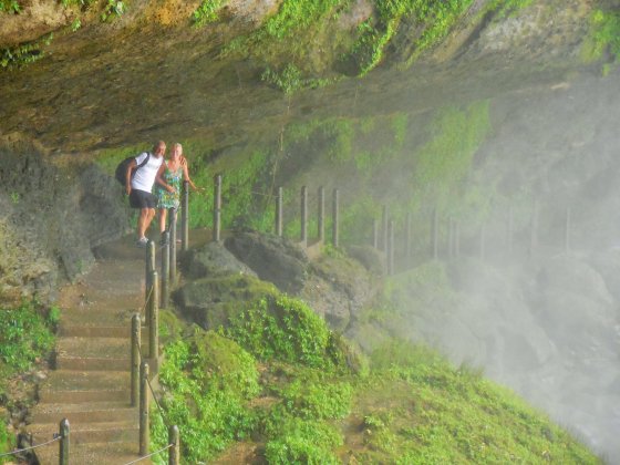 The next morning we were off to the Palenque Archeological site, led by the Steinfort’s, which is exceptional to see in this jungle setting. No big crowds and mostly European tourists, the site itself is massive. To date only 5% of the existing structures have been uncovered sitting on approximately 1 square mile. Over 1500 structures remain beneath the jungle on the mountain side into the valley. The weather was changing and the rain was upon us. Lisa and I went swimming in the pool back at MayaBell during one of these downpours, what a fabulous experience. It rained heavily off and on the rest of the afternoon and overnight however we were greeted with lots of blue sky in the morning. At 10:00 am the group headed out in the Baja Amigos Collectivo to Misal Ha, a very popular waterfall and possible swimming location not far away from Palenque. Some terrific scenery on our short drive as we climbed for 200’ (75m) to almost 1000’ (300m) into the jungle.