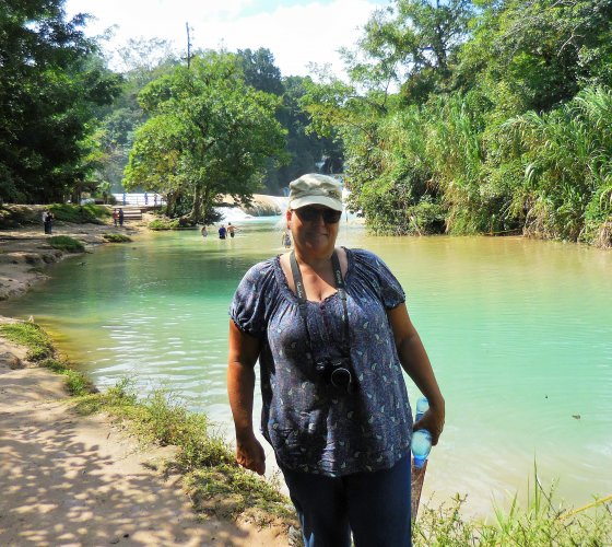 The next morning, February 19, we headed off to Agua Azul, another must see location popular tourist stop, this time led by Rafael & Eileen. Although the drive was relatively short, less than 70 km or 45 miles, it took us almost 2 hours to reach our destination. It reminded me of the drive to Pender Harbour on the Sunshine Coast from Halfmoon Bay onwards, lots of winding road posted at 60 km (40 miles) and hour. Add some villages with topes and small children selling local produce then a road block, only a thin rope across the road, again with small children, very persistent in collecting 20 pesos for produce or just collecting. Aside from the delays the scenery was spectacular, mountainous and jungle all the way. The falls at Aguq Azul were equally spectacular as they made their way down the mountain slope 10 or 20 feet (3-6 m) at a time. Many shops selling locally produced goods and lots of choices to eat as well. After lunch the gals went shopping and most of the guys relaxed, soaking up the sun and enjoying a cold beverage. A local Victor stopped by and we had a good chat with him, I thought maybe he was 18 or 19, turns out he is 30 with 2 sons and has been married for 13 years. We met another couple from Canada, Fran & Doug who arrived later in the afternoon and are heading to Central America. They joined us for dinner at a local restaurant Victor recommended. Most had the fresh fish specialty, I had the breaded chicken, and dinner was delicious.