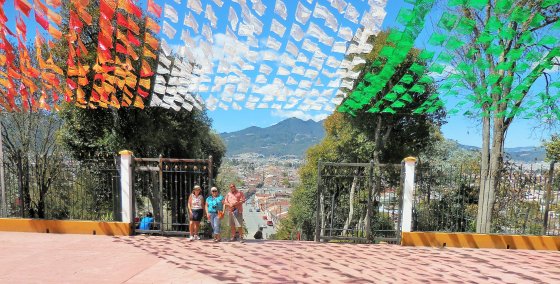 Today we headed into San Cristobal Centro and the city lived up to the hype, what a beautiful place. We were able to find parking near the Zocalo for our explorations and headed out to see what the town had to offer. We made our way up to a small church on a low rise for a better view of the city, very impressive church inside as well. Did lots of poking around in many shops and bought some more calcomanies (bumper stickers). Later we had lunch with many of the gang on a roof top restaurant on the main square, there was a celebration going on so lots of fireworks banging about. After lunch the group met at the van and we headed back to the RVs for a siesta and then at 5:30 pm out for some groceries, tomorrow another day in San Cristobal.