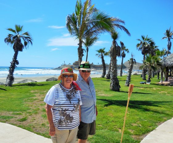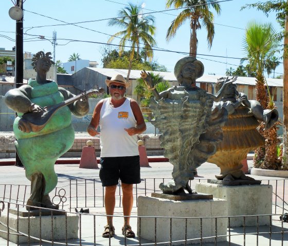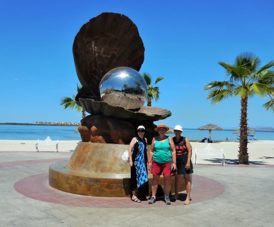 La Paz – The next day a late start for everyone as Todos Santos really did wake up until 10 AM. Lots of celebrations around during Easter week and we came across a Caballeros at the entrance to Todos Santos. After getting everyone parked the gang set out in many different directions around town which always includes the famous Hotel California made so by the legendary band The Eagles. Good thing we did not take the main drive, it was all tore up and under rebuild as well (underground power supply I understand). We had brunch with Mark, Katherine and Sylvia and yes the Hotel California were in, but not the Tequilla Sunrise calcomanies. After lunch we headed for our destination, Campestra Maranatha just north of La Paz. It was going to get hotter and we knew this, after our short stop at Walmart, we arrived at the RV Park and it was 38.8 C or 101 F. Good that the pool was open, we needed to cool down.