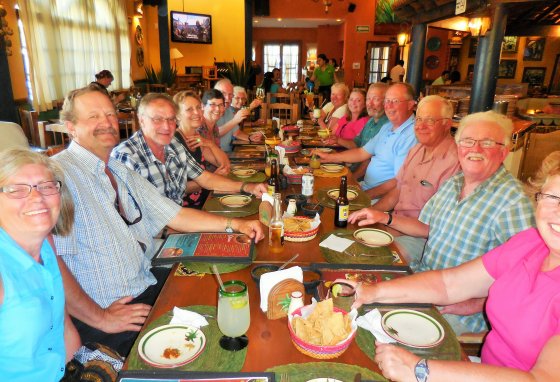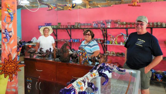 Sunday we headed for the Malecon walkabout, and Bill, Bev, John, Morag and Val caught a boat to swim with the Wale Sharks who were in the bay. Other checked out the lower town and we went to our favourite Hamburger & Hot Dog Stand for lunch. Later most of the gang joined us for dinner at Los Magueyes, again very authentic Mexican menu but very different to La Pasadita. The meal did not disappoint, neither did the flaming flan! Monday and most headed off to Ibarra’s Pottery, Johnny, John, and Tim had a 7 am fishing trip planned. After seeing Vicky and her Mom we were off to the market and walkabout in town, lots were astonished when they cheked out the Yeneke Hotel, words just cannot express the décor.