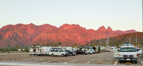 Puerto Escondido – 8 am on Tuesday and we continued our northward journey, today’s destination the Fonatour Marina at Puerto Escondido. No trouble getting parking now as they have a fee schedule set for RVs and we had made reservations for dinner, unfortunately with confusion. We had attempted to make reservations at the new waterfront restaurant, they ended up being at the Tripui Hotel, and eventually we did sort this out, with folks eating at both. The meal at the new place was expensive but very tasty, not sure they have the clientele to support the fine dining in the future, we will see next season. Interesting enough I had a hot shower, while other did not, really not sure why? The sunrise was beautiful the next day, unimpeded by any cloud cover, the mountains were as red as they can be, breathtaking for sure.