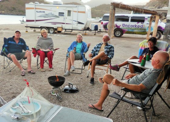 Ricardo greeted us at Rice & Beans and yes the Margaritas were still great. The tour into town included a stop at the Tortillaria for fresh tortillas. Off early in the morning for Playa Santispac and more new road just north of the Devil’s Grade, probably 5-6 km long, yes it all helps. They should take some of that equipment because the road into Santa Rosalia is awful, pot hole city. We arrived at Santispac intact, not many on the beach. Our friends Barb & Dennis from Ontario were there, as was George. Jack & Eric had taken the point where Bruce & Marian usually camp. The group took a boat trip and everyone had good use of the Kayak and SUP. The wind came up on Day 3 which was our Excursion Day to the beaches. We dropped in on Gwen & Gord at La Posada. They were on Los Cocos for many years decided to move to a more permeant spot, it was good to see them. Our Potluck dinner was good as always but we missed Bruce & Marian’s fire.