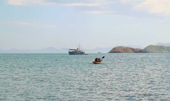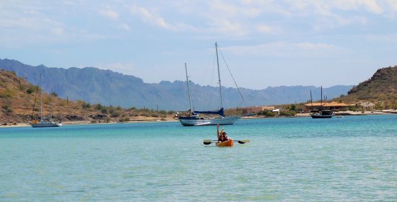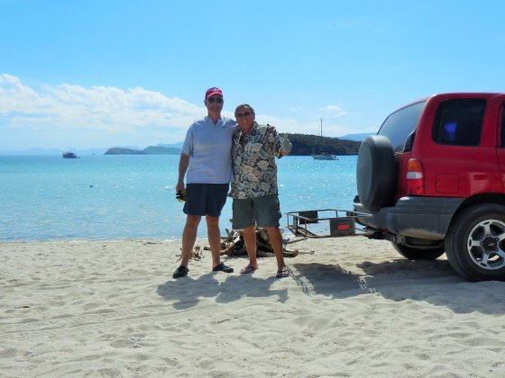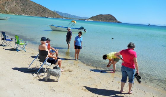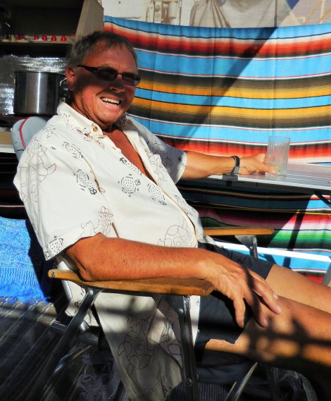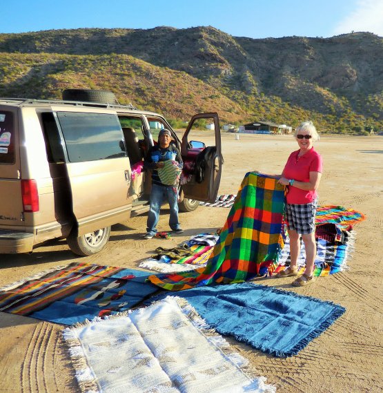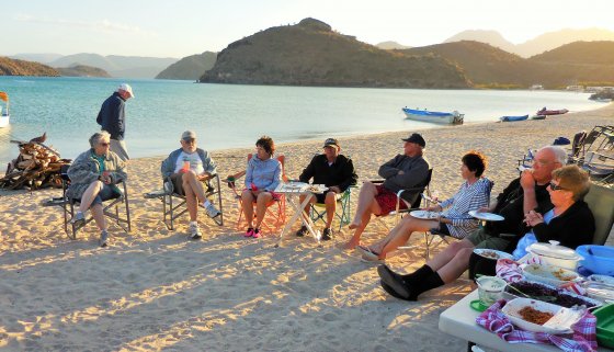 Day 6 and we were off to the beach and Playa Santispac in Bahia Concepcion. We arrived under sunny skies and some wind. After set up Bruce and I headed into Mulege to place a call to Dom and Bruce had a few errands to run. Later Roland & Janice hosted a Happy Hour to thank everyone for the help and understanding with the flat repairs (2 in 2 days) at the outset of the tour. We met our neighours Pate & Cindy from California and Dave & Denise from the Sunshine Coast in BC. The next day the wind was down and we took the Kayak off for folks to try out. Bruce & Marian provided the fire wood but could not make the Potluck which was terrific. Later with some wind we had a great campfire on the beach listening to some tunes, was nice. On the beach we saw Steve & Dale (Placerville), Gord & Kathy (Rossland) and George (Peachland) who we first met over 10 years ago on El Requeson.
