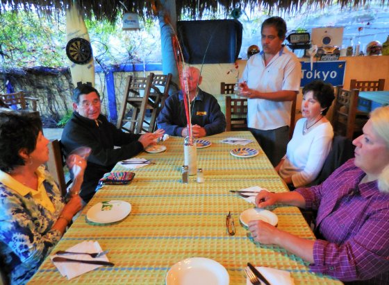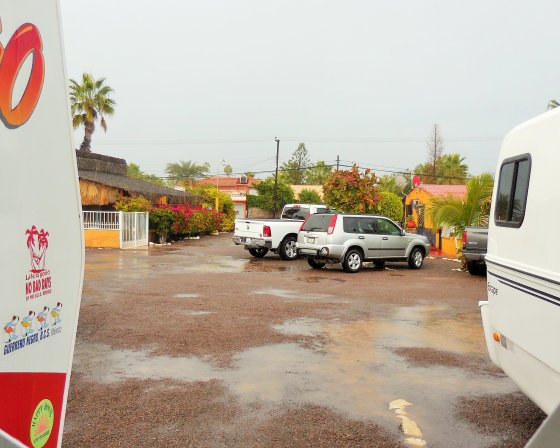 February 16, 2015 – Today the sun is scheduled to reappear as we continue our southward journey to Ciudad Constitucion on our way to Cabo San Lucas. This is a very different start to our day yesterday, where the lightning and thunder, followed by lots of rain (buckets) awoke me at about 4am and continued for some time. It did clear up for our excursion to San Javier, the road was in ok shape except for dodging some rocks. We had a good look around and returned under mostly sunny and warm skies. Then after some errands in the early part of the afternoon the thunder and lightning started again and it poured. About an hour before our Baja Fiesta Dinner the precipitation stopped and before you knew it we were loading up the Van and Giggling Dolphin bound. We able to park at the gate to the restaurant, good thing the water was 6 inches deep on the street and went curb to curb, I had to exit thru the sliding side door myself. Dinner was good, Ubaldo always the gracious and attentive host and the musicians performed some new tunes thanks to Gus’s requests, yet another Baja experience to remember.