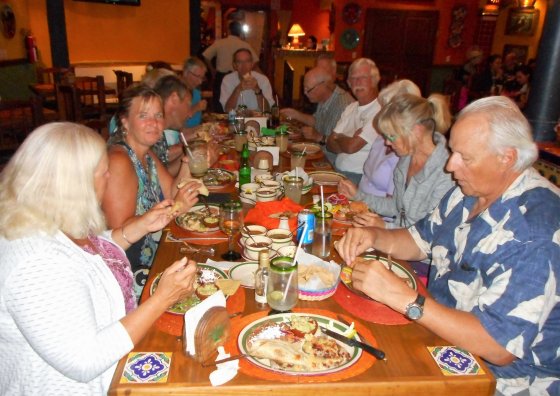 2 pm came and we picked up the group at the Pearl/Clam Shell sculpture on the Malecon. In our absence Omar showed up and Wayne & Anke were able to fill their RV with purified water. Corrine spent the day poolside and Lisa went for a swim when we returned, for me a well deserved siesta. Gabriela showed up with the laundry as expected on time, for us only $150 pesos delivered, only $19 Cdn. When we headed out for dinner at Los Magueyes, Wendy a single BC gal in the campground heading to the mainland joined us. Dinner was good as always at Los Magueyes, Alfonso took good care of everyone, we even had some Flaming Flan. When we left it started raining and we were treated to lighting and thunder. This made for quite a drive on the Malecon, crowded with locals taking cover from the downpour. We had planned to sit around the fire and say our goodbyes to Tim was dropping off, we delayed that because of weather and did so the next morning.